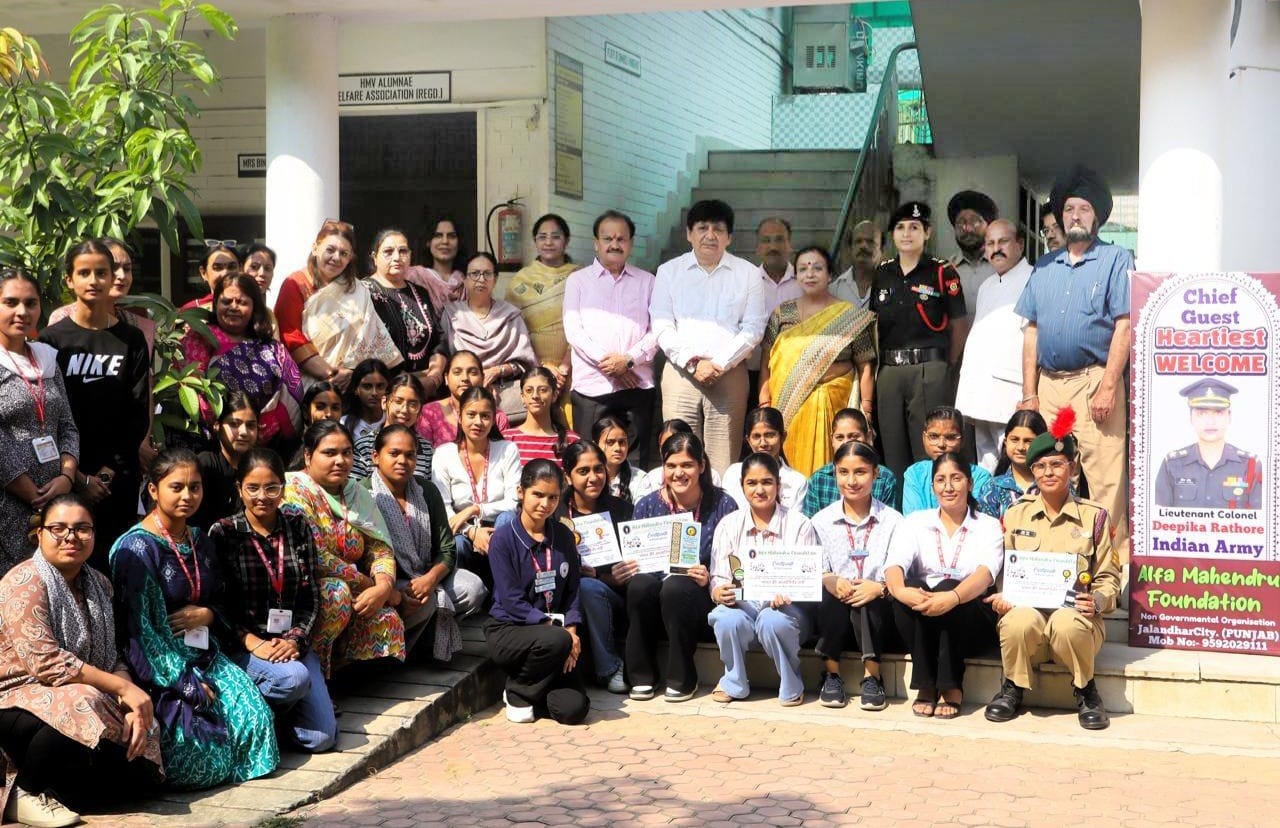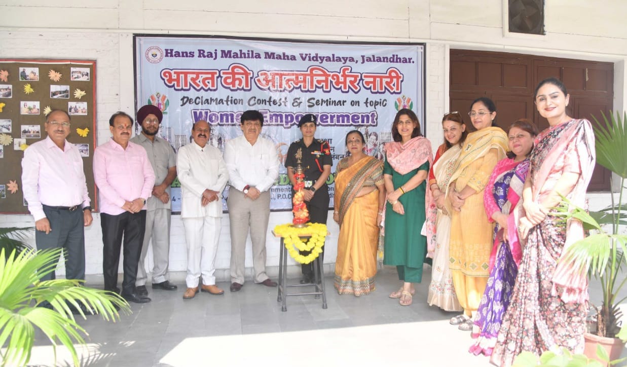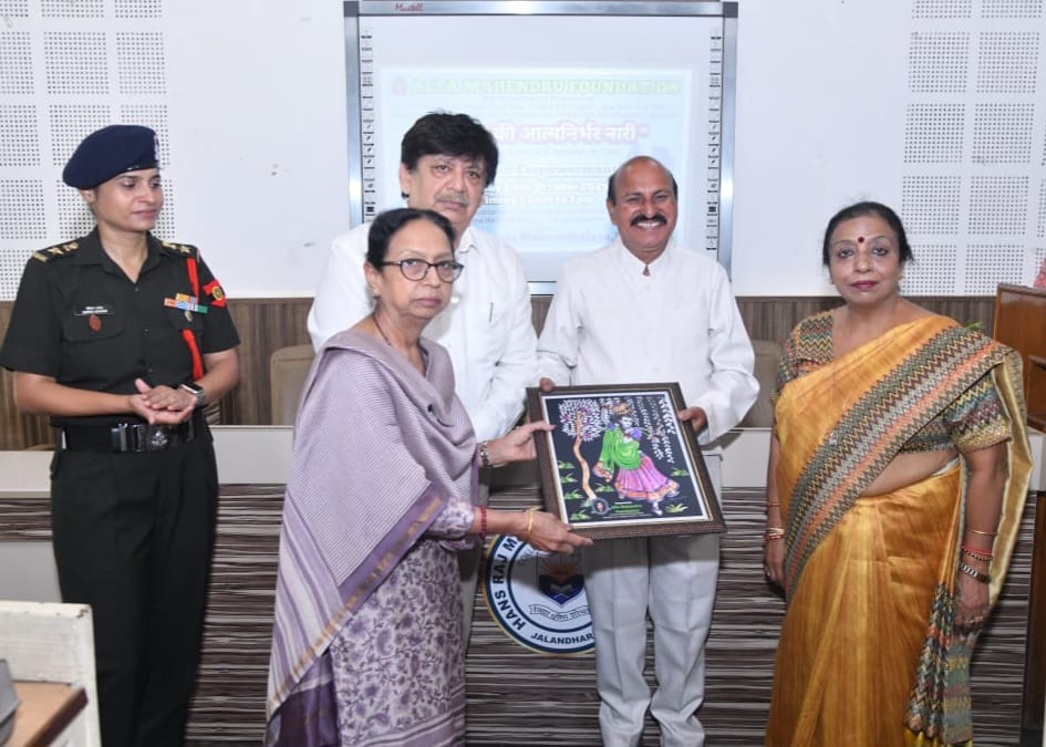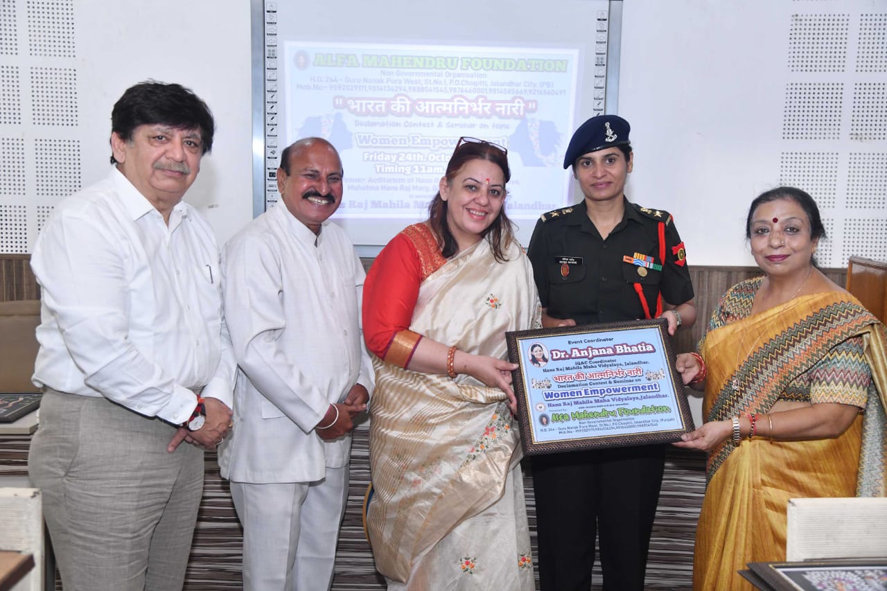 जालन्धर 28 अक्टूबर (ब्यूरो) : महानगर की अग्रणी ग़ैर सरकारी संगठन अल्फ़ा महेन्द्रू फाउंडेशन द्वारा हंस राज महिला महाविद्यालय विद्यालय के सहयोग से कॉलेज परिसर में महिला सशक्तिकरण प्रोजेक्ट के तहत ” भारत की आत्मनिर्भर नारी ” विषय पर भाषण प्रतियोगिता एवं विचार गोष्ठी का आयोजन किया गया । जिसकी मुख्यातिथि भारतीय सेना से लै॰ कर्नल दीपिका राठौड़ थी। उनका स्वागत मां भगवती के आशीर्वाद स्वरूप लाल चुनरी व फूलदान देकर फाउंडेशन के अध्यक्ष रमेश महेन्द्रू व उनकी टीम ने किया।