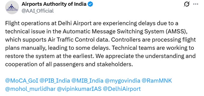 भारतीय विमानपत्तन प्राधिकरण (Airports Authority of India – AAI) ने सोशल मीडिया प्लेटफॉर्म एक्स (X) पर बताया कि एएमएसएस (AMSS) में आई तकनीकी समस्या (Technical Issue) के कारण उड़ान संचालन (Flight Operations) प्रभावित हो रहे हैं। फिलहाल कंट्रोलर उड़ान योजनाओं को मैन्युअली (Manually) प्रोसेस कर रहे हैं और तकनीकी टीमें (Technical Teams) सिस्टम को जल्द बहाल करने में लगी हैं।