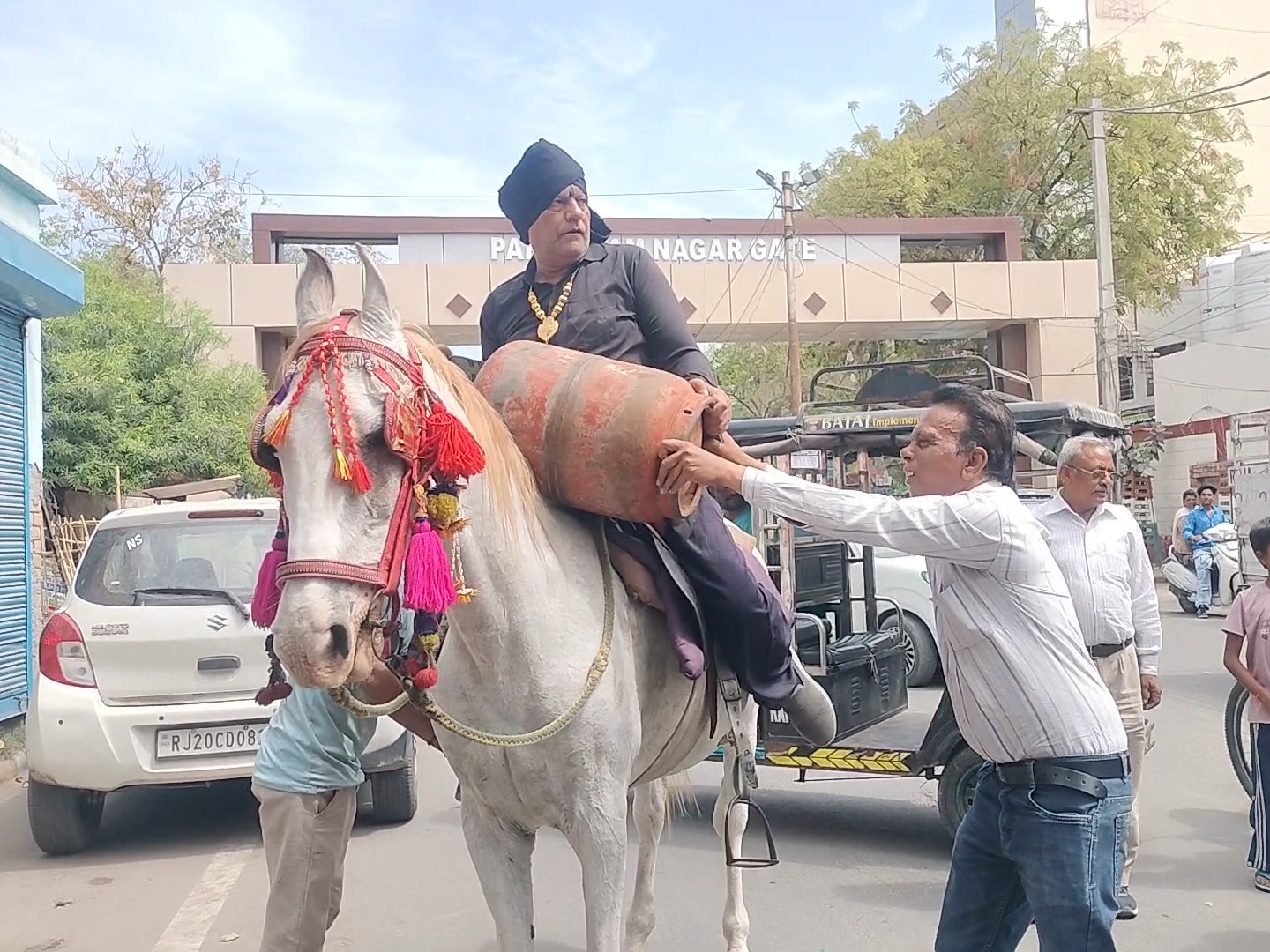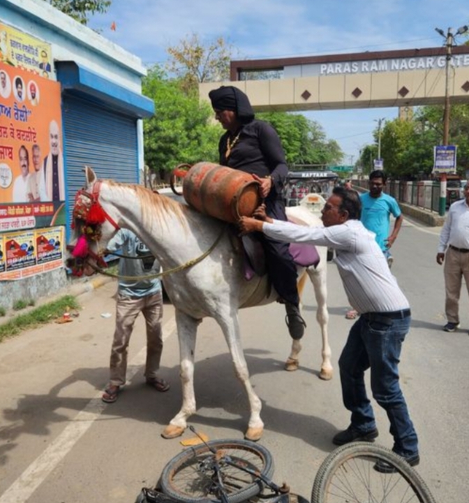 न्यूज नेटवर्क 29 मार्च (ब्यूरो) : प्रदेश में रसोई गैस की किल्लत को लेकर बठिंडा में एक अनोखा विरोध प्रदर्शन देखने को मिला। लाइन पार क्षेत्र के पूर्व पार्षद विजय कुमार ने पारंपरिक धरना देने के बजाय अलग अंदाज अपनाते हुए घोड़े पर सवार होकर डाकू का वेश धारण किया और प्रतीकात्मक रूप से गैस सिलेंडर ‘लूटकर’ अपना विरोध जताया। उनके इस अनोखे प्रदर्शन को देखने के लिए मौके पर लोगों की भीड़ जमा हो गई।
